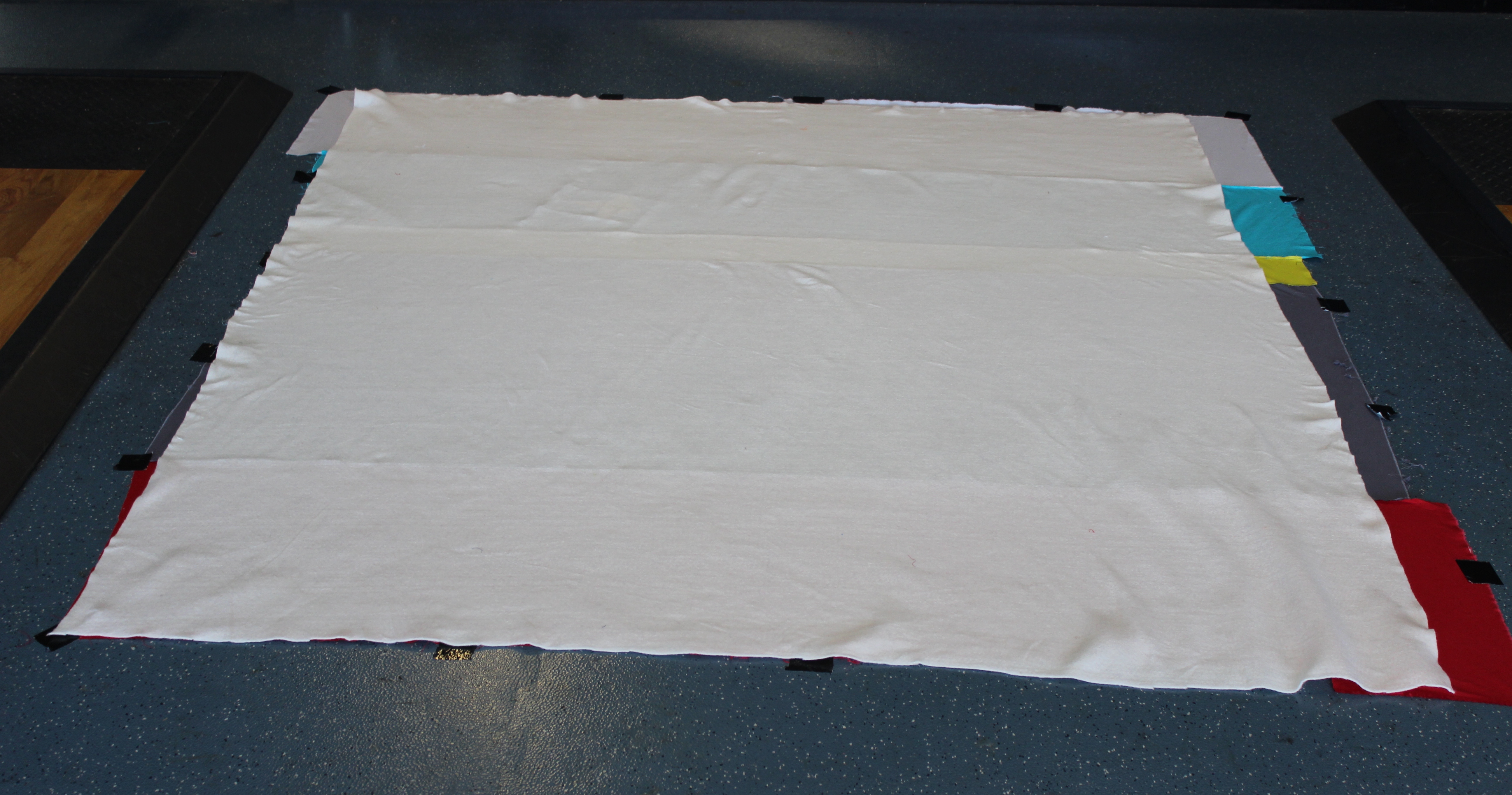 I didn’t have a large floor to assemble the quilt sandwich. I took over the local high school’s weight room on a Sunday afternoon. (thanks to my sweet husband who is the head football coach)