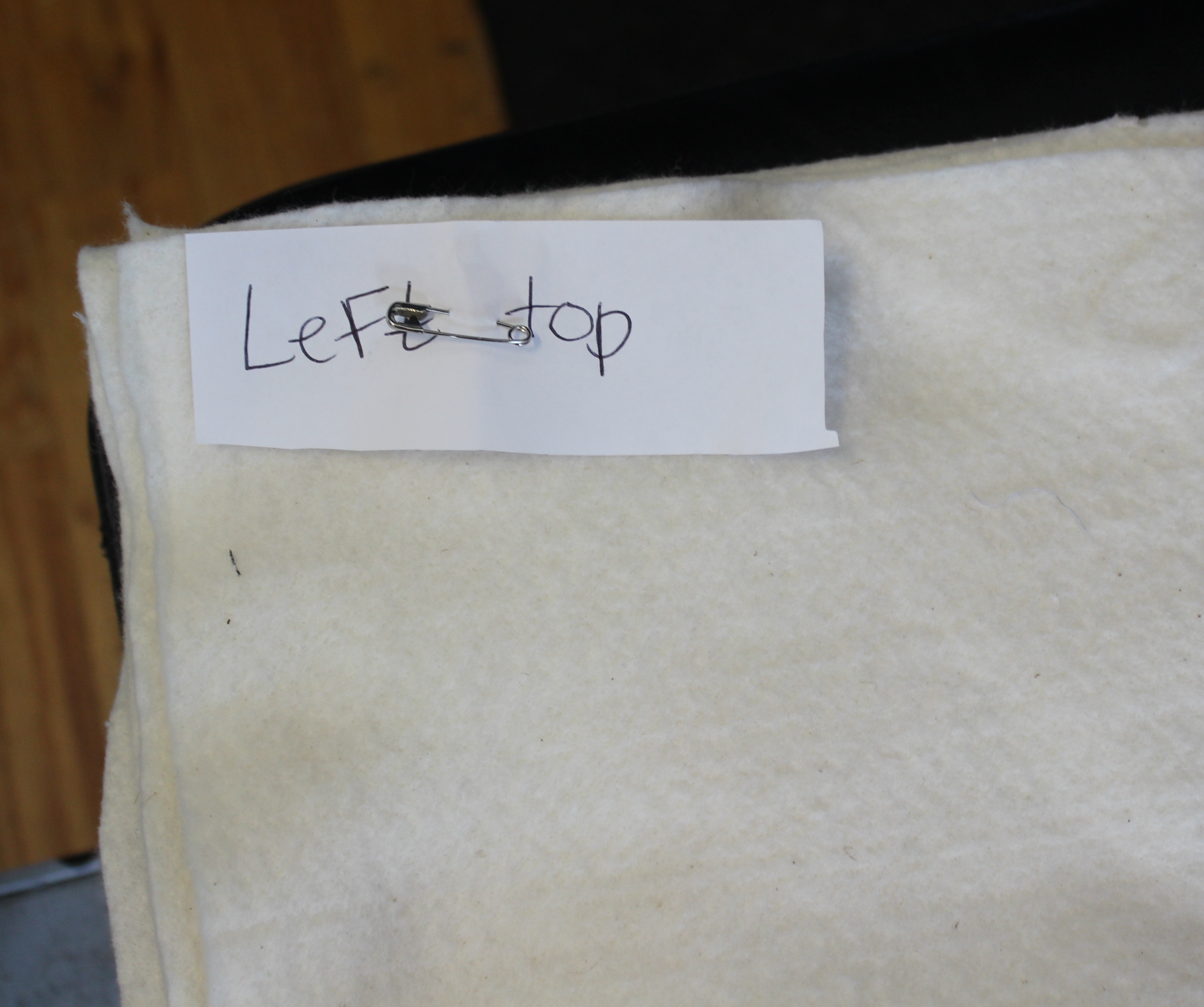 I pulled the top and back away from the batting and cut the batting in a wavy line with scissors — about 2 inches from the safety pins.