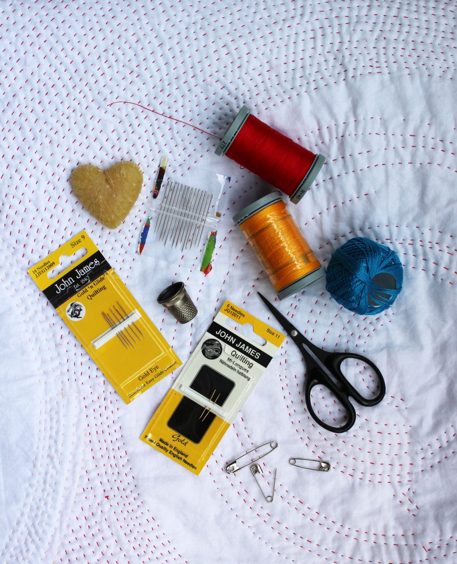 - Needles: Size 9 and 11 made by John James for small stitching and a variety of needles from the Big Stitch Quilting Needle Pack made by Colonial Needle Company for big stitching.