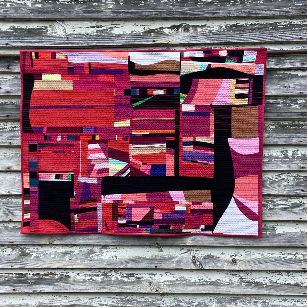 The 2023 Pantone Color of the Year is Viva Magenta. Elizabeth Ray and Sarah Ruiz are hosting this year’s Quilt Challenge. I knew I had a box of scraps in this color and similarly-colored scraps. I wanted it to feel moody like the artwork from Pantone. Half way through the process it began to look like a geological dig. I started calling it Shaft Mines.