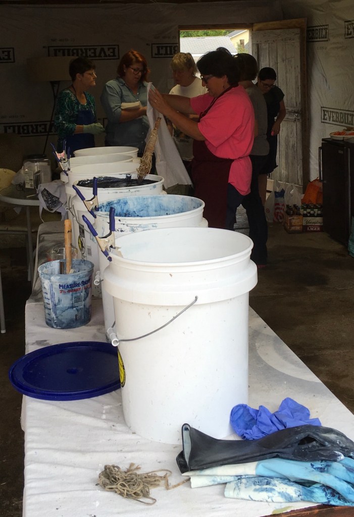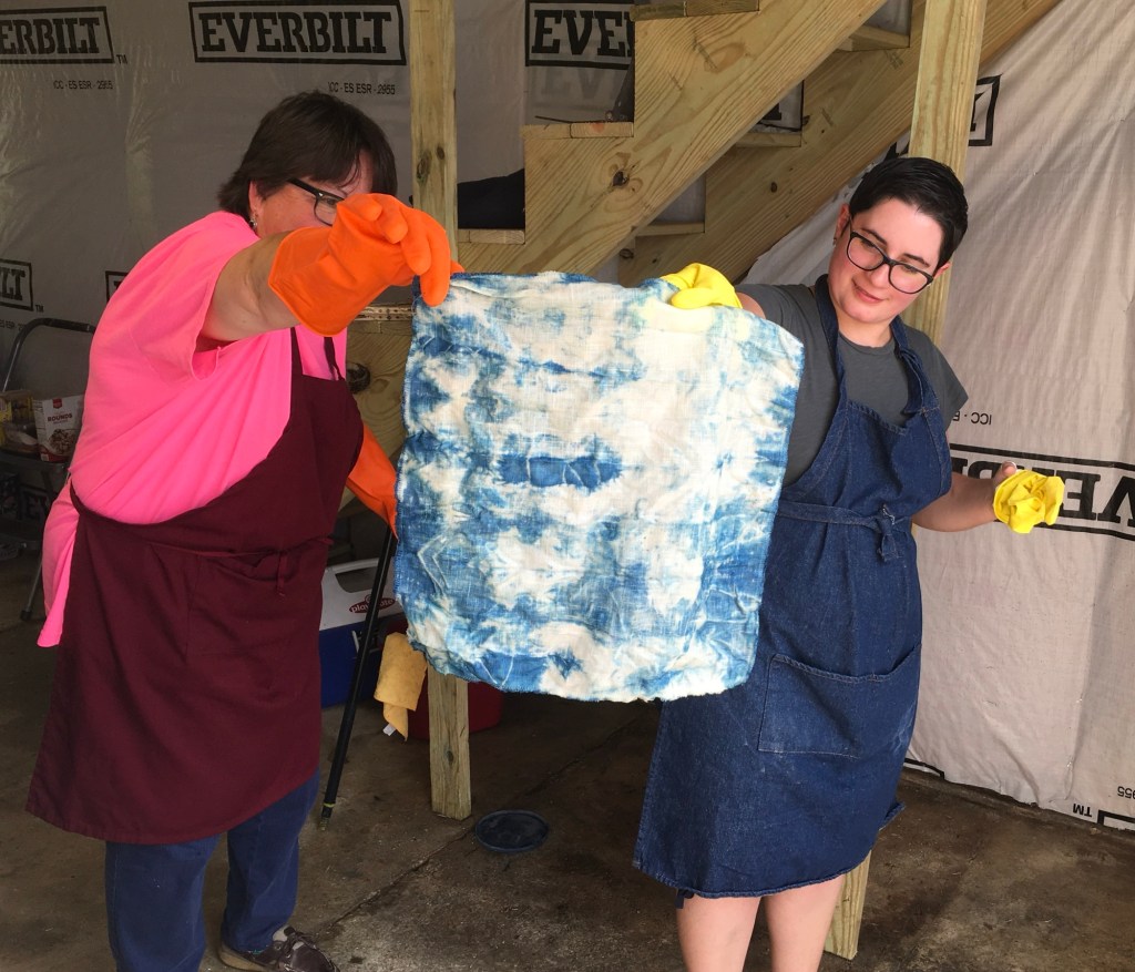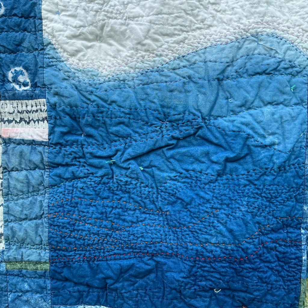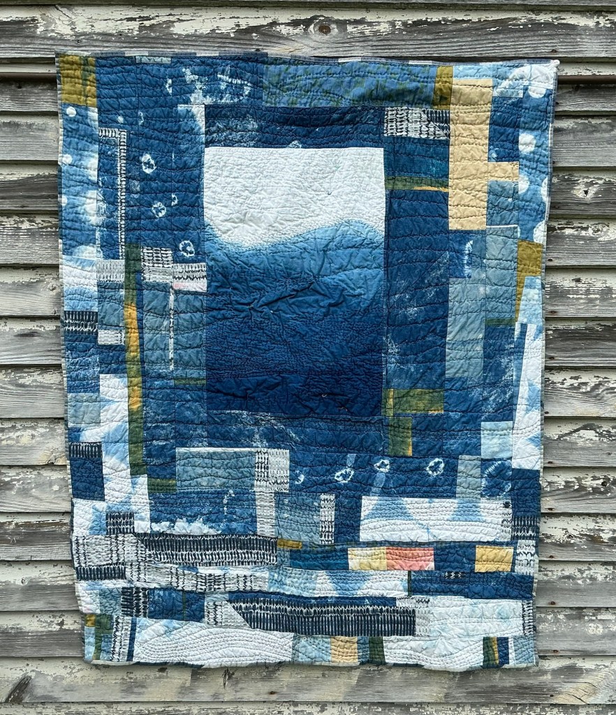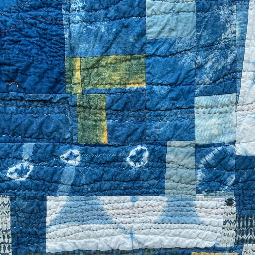 This quilt has a history. I have lots of hand-dyed indigo fabric. I learned this technique at Slow Stitching Retreat in Washington, Maine in 2017, hosted by A Gathering of Stitches, and taught by Kim Eichler-Messmer. That fall I hosted guild members at my home, and we dyed fabric. It’s nice to remember those times with those pieces. There are also a few remnants I received from Ana Conceicao, a guild member who works at UFab.