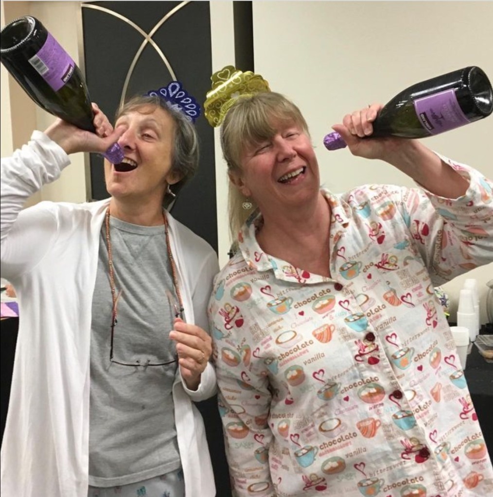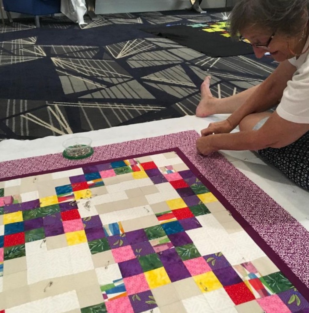 My friend Phyllis Mondak died recently. She was generous and kind. She had a knack for making people feel welcome. About a week ago, we had a virtual conversation about sewing barefoot and the dangers of falling seam rippers. I have this photo of her basting a quilt in the hotel hallway at a guild retreat in 2019– barefoot of course.