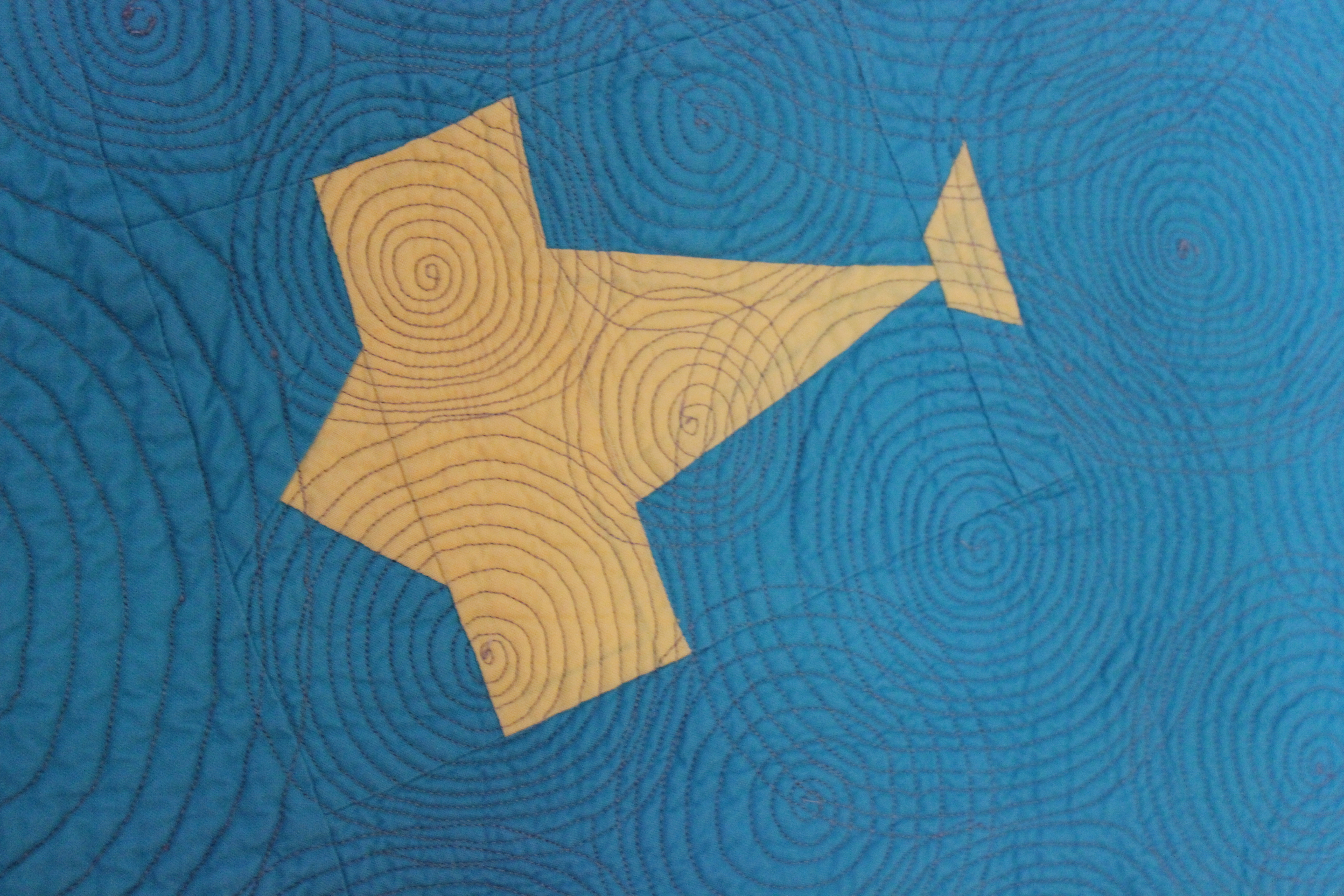 The Bear’s Paw block is typically made with a square as the paw of the bear and the half-square triangles as the “claws”. I machine quilted “paw” prints, instead of pieced squares adjacent to half-square triangles. I chose prints in paisley, feathers and geometric circles for the “claws”.