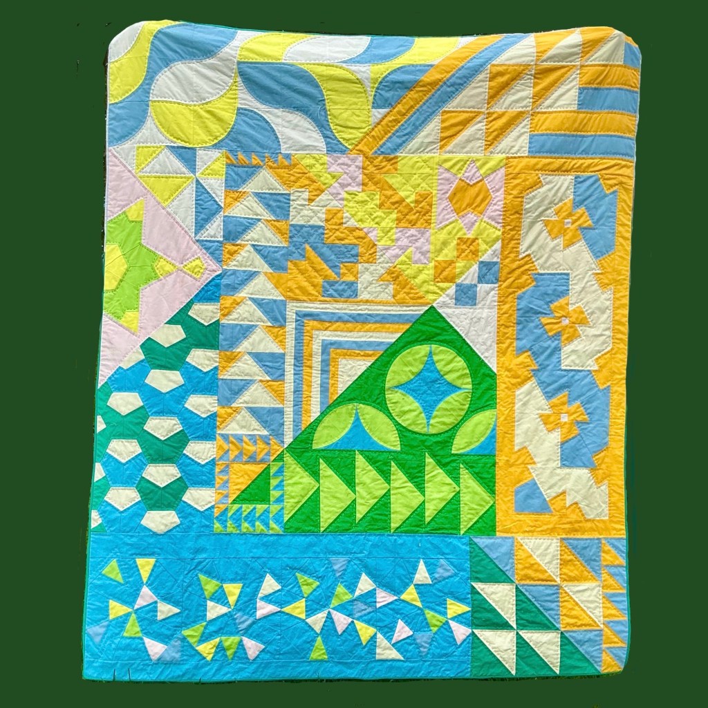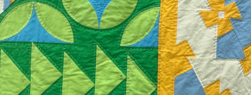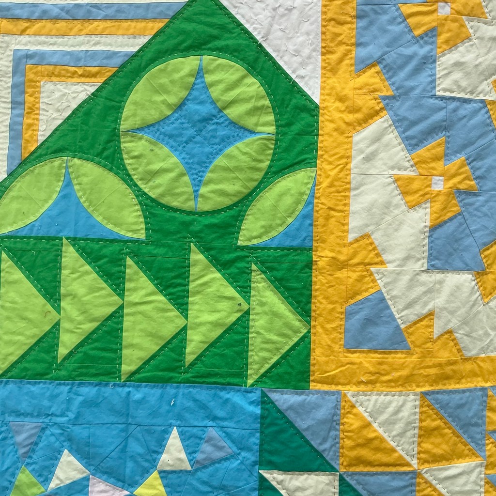 My mother, Rhoda Alice, made the appliqué girls on the back from clothes she made for my sister and me. Polyester! And those prints are adorable plus the color combinations were inspired.