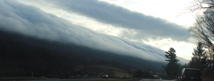 As we were traveling to Southwest Virginia, USA, to visit family over Christmas, the sun was shining through the clouds, and the clouds were rolling over the mountains. I was captivated by how the clouds hugged the mountains.